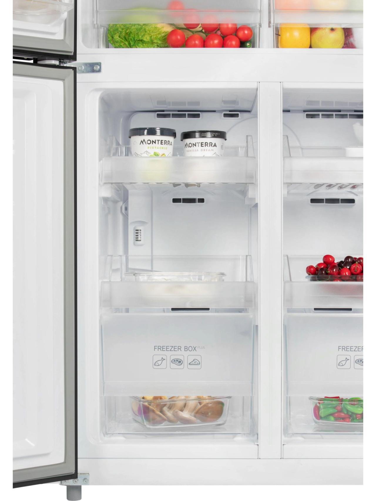 4-х дверный холодильник имеет единое пространство верхних полок холодильной камеры, чтобы удобно было размещать габаритные кастрюли и контейнеры. Прочные полки из закаленного стекла можно регулировать по высоте, а ящики в холодильной камере предназначены для хранения овощей и фруктов и оснащены влажной зоной свежести и сухой.