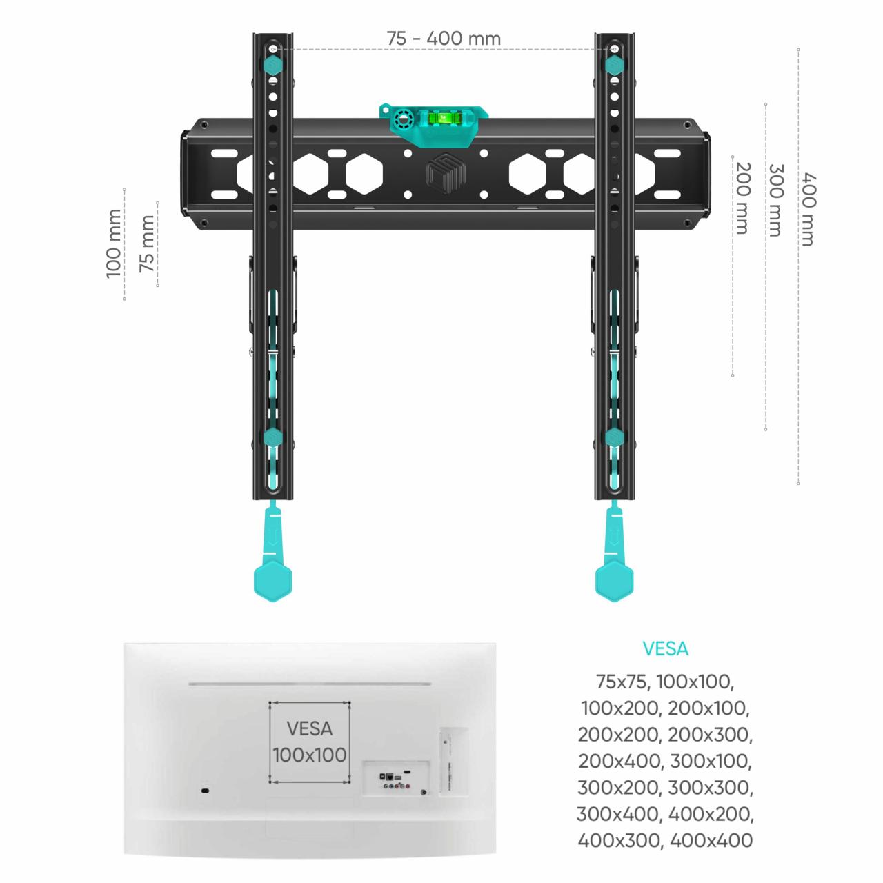 встроенный уровень; система фиксации "Просто щелчок"; материал: холоднокатаная сталь, SPCC class; производитель по результатам испытаний изменил диагональ и вес поддерживаемых телевизоров в большую сторону; производителем была изменена максимальная поддерживаемая диагональ с 55" до 65"; совместимость: кронштейн подходит для большинства телевизоров популярных брендов, среди которых Samsung, LG, Sony, KIVI, Tcl, Xiaomi Mi, SUPRA, Panasonic, Hyundai, Erisson, Asano, Horizont, JVC, Thomson, HARTENS, Sharp, Toshiba, Skyworth, BBK, AVEL, Витязь, Веко, BQ, DEXP, SkyLine, Pioneer, Rolsen, Harper, Hisense, Hitachi, Polarline, Prestigio, Telefunken и других