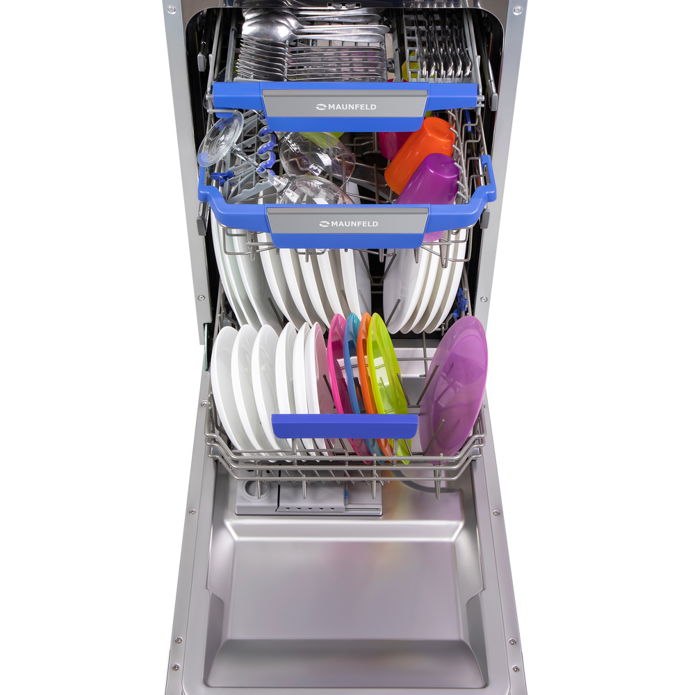 Узкая встраиваемая посудомоечная машина MAUNFELD MLP-08IMR бережно экономит место на кухне: корпус шириной 45 см легко вписывается в стандартный шкаф, а фасад остается аккуратным и цельным.
