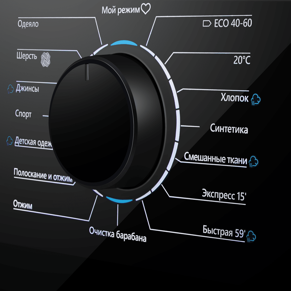 Сохраните любимые настройки в программе «Мой режим»: установите температуру, скорость отжима и дополнительные функции — затем запускайте цикл одним поворотом регулятора. Электронное управление и понятный дисплей помогают контролировать процесс, а индикация этапов всегда показывает текущую фазу стирки.
