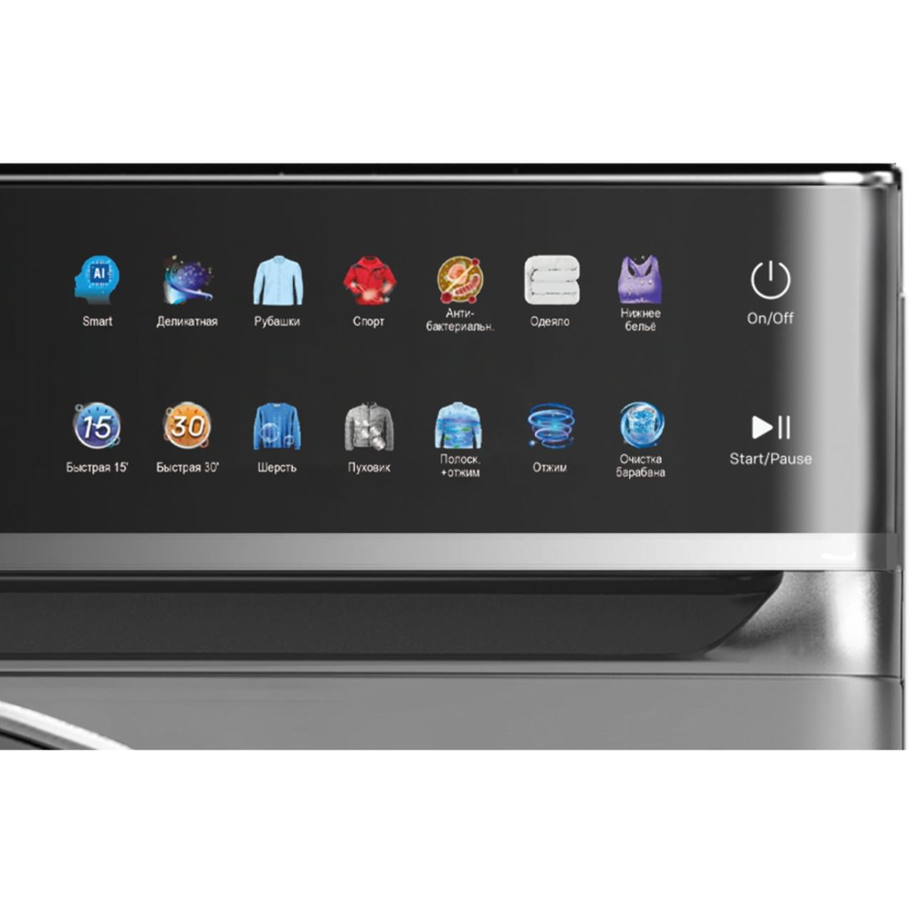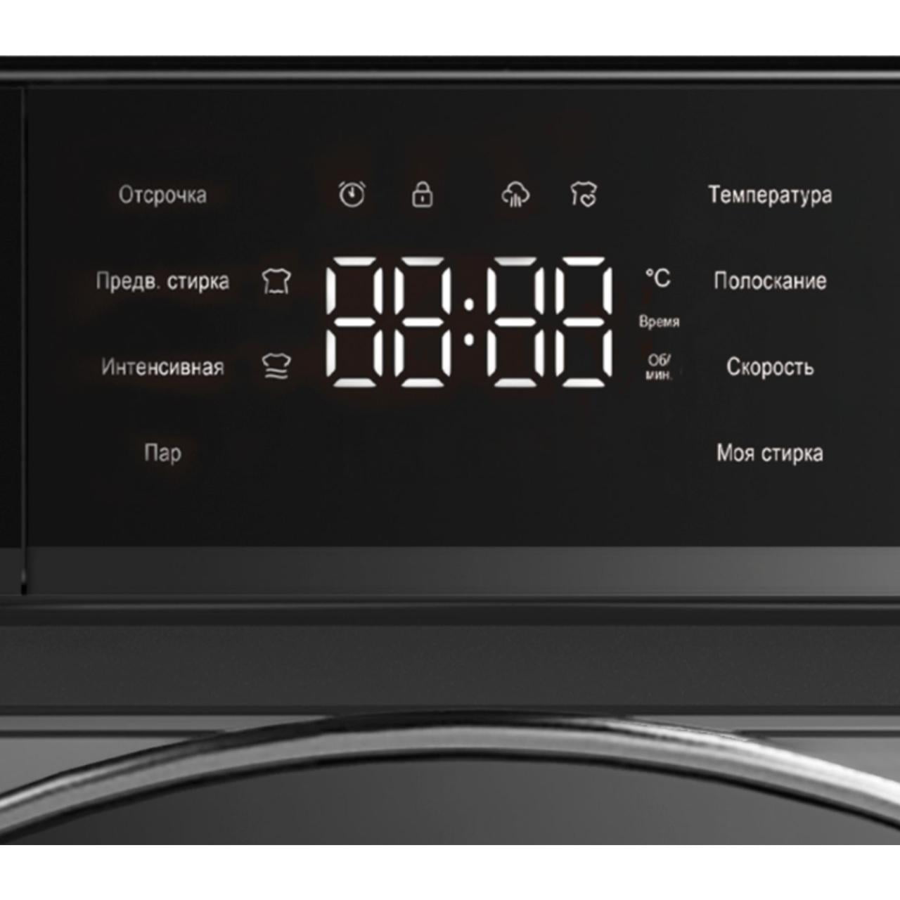 Сенсорная панель управления позволяет интуитивно установить оптимальную программу с предустановленными настройками, отрегулировать температуру и скорость отжима. На цветном LED-дисплее световой индикацией отображается вся информация по выбранной программе и типу стирки, таймер, температура воды, скорость отжима, количество циклов полоскания, время отложенного старта и код ошибки.